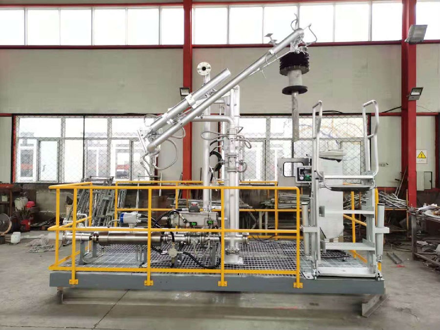 下裝鶴管采用鶴管的機械部件和自動加油系統(tǒng)(如泵、流量計、電液換向閥、防靜電系統(tǒng))為一體,使鶴管自動化程度提高,操作人員輸入一次貨油定量信息,可同時發(fā)送1-4個品種。